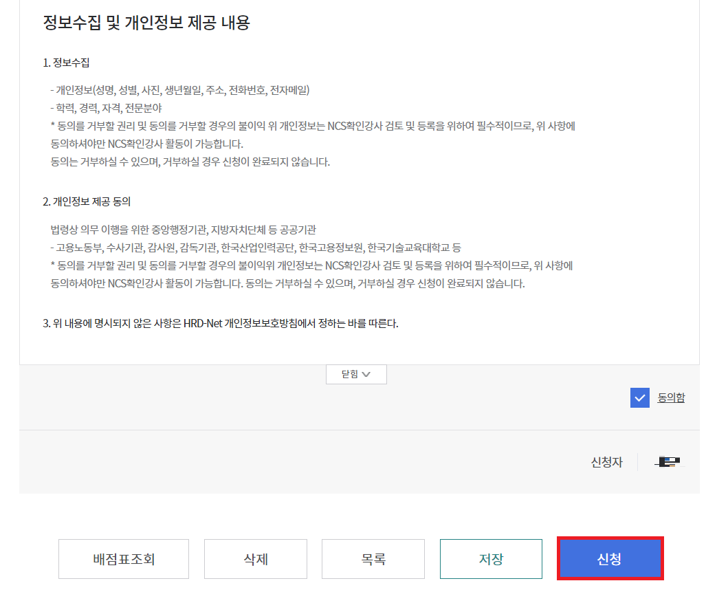 이후에 약관을 잘 확인한 뒤에 문제가 없다면 [동의함]에 체크한 뒤에 [신청]을 진행하시면 됩니다.