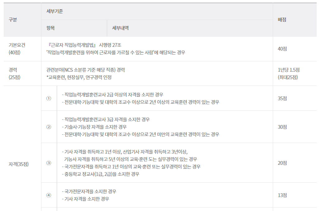 그리고 NCS란 국가직무능력표준(National Competency Standards)을 의미하는 단어입니다. 이때 NCS 확인강사 제도는 훈련 교·강사의 정보를 효과적으로 관리하고 처우 개선을 위하여 만들어진 것입니다. NCS 확인강사를 신청하게 되면, 각 교사와 강사에 대하여 일정한 평가기준에 따라서 평가점수를 부여합니다. 교·강사가 직접 신청하여 NCS 확인강사로 등록될 수 있습니다. NCS 확인강사를 신청할 때는 정확한 NCS직종을 선택하고, 적절한 자격증이나 실무 경력을 기재하여 점수를 부여받게 됩니다.