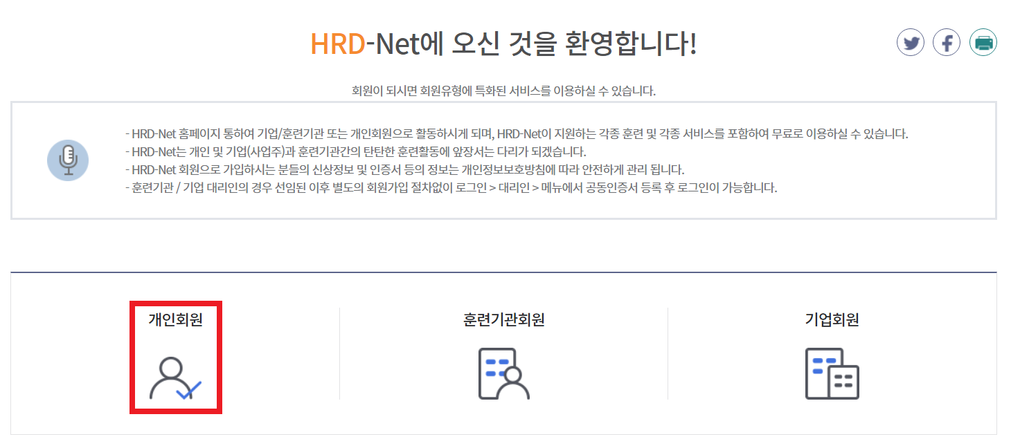 이후에 다음과 같이 [개인회원]을 선택하여 회원가입을 진행했습니다. 참고로 중간에 고용노동서비스 One-ID에 가입하겠냐는 메시지가 나왔는데, 필자의 경우 HRD-Net 웹 사이트만 이용할 것이기 때문에 그냥 [아니오]를 누르고 넘어갔습니다.