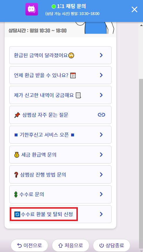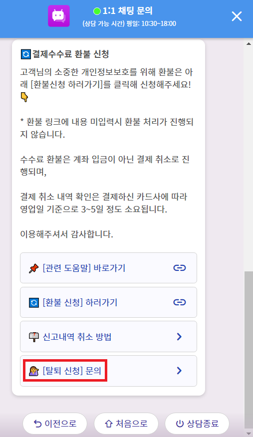 🤷♂️ : 탈퇴는 어떻게 하나요? 1. 고객센터 우측 하단 문의하기 버튼을 클릭합니다. 2. '수수료 환불 및 탈퇴 신청' 버튼을 클릭합니다. 3. 메뉴 중 '[탈퇴 신청] 문의' 버튼을 클릭