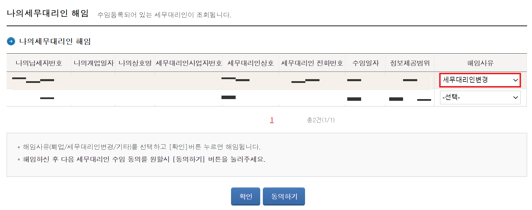 다음과 같이 [나의세무대리인 해임] 페이지에서 기존의 삼쩜삼 서비스에 해당하는 세무대리인을 [세무대리인 변경]을 통해 없앴다. 이후에 새로운 새무대리인에 대하여 [동의]를 진행했다.