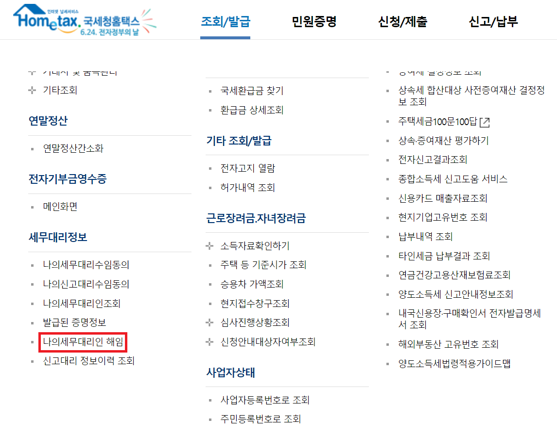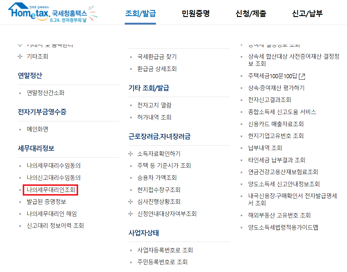 홈택스(Hometax)에 로그인한 뒤에 [조회/발급] - [나의세무대리인조회] 란에 접속하면 세무대리인 정보를 확인할 수 있다.