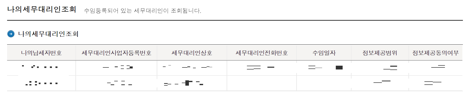 결과적으로 [나의세무대리인조회] 페이지로 이동하면 다음과 같이 현재 등록되어 있는 세무대리인에 대한 정보가 출력된다.
