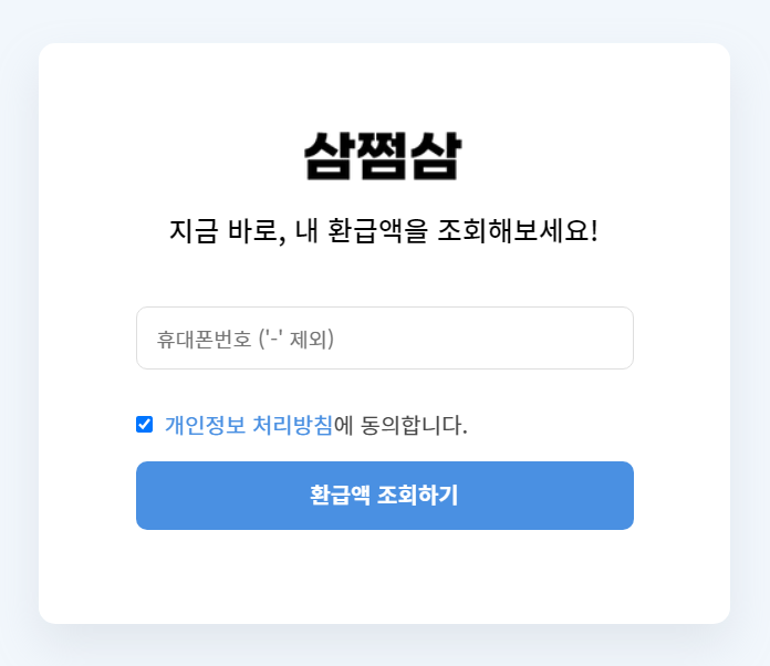 기본적으로 삼쩜삼 사이트에 접속하면 다음과 같이 [휴대폰번호]를 입력하여 환급액을 조회할 수 있다.