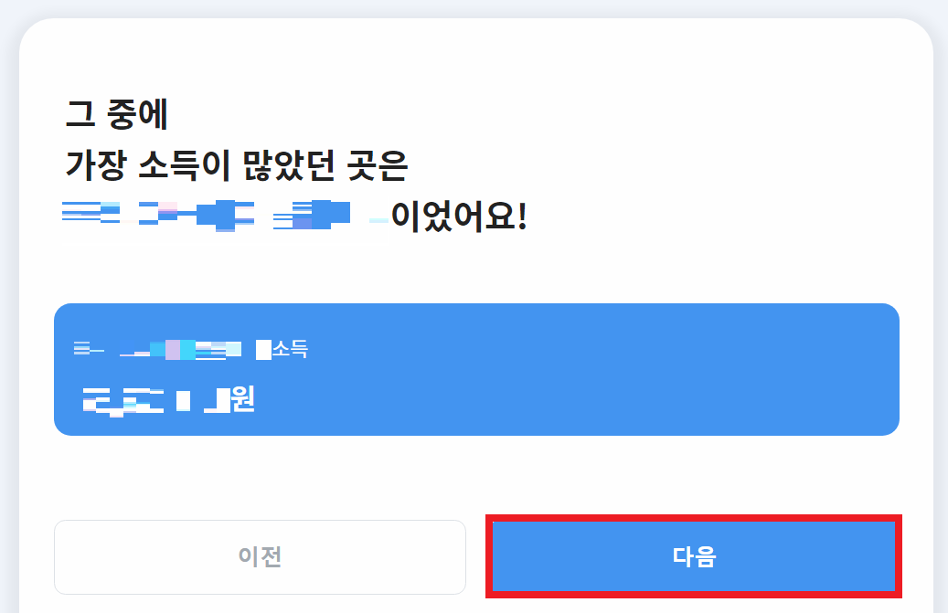 [다음] 버튼을 누르고 넘어오면 다음과 같이 가장 많은 소득을 줬던 회사명이 나온다.