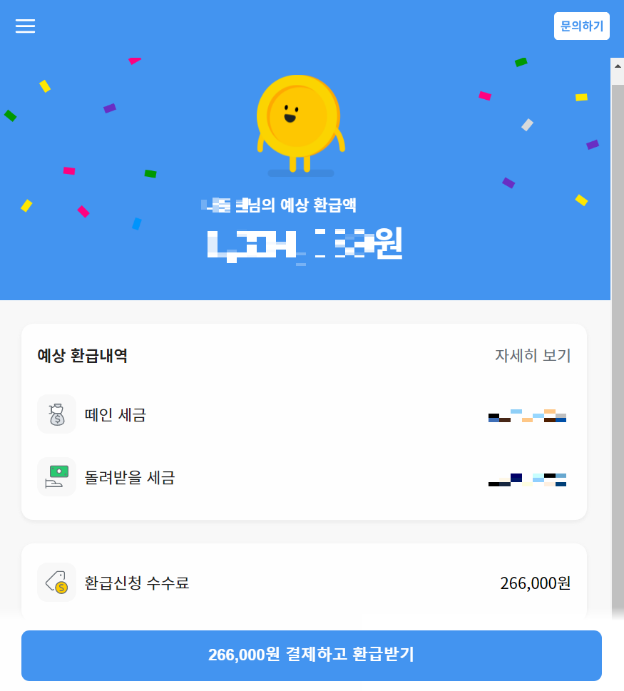 필자의 경우 다음과 같이 [예상 환급액]이 나오게 되며, [환급신청 수수료]가 나온다. 필자의 경우 266,000원을 결제하면 일정 금액을 환급받을 수 있다고 나왔다. 다만, 필자의 경우 당해 년도 사업 소득, 기타 소득이 모두 포함되어 있기 때문에 이렇게 단순히 종합소득세를 납부하면 안 될 것 같기 때문에, 필자는 삼쩜삼 서비스를 이용하지 않고 세무사를 이용했다.