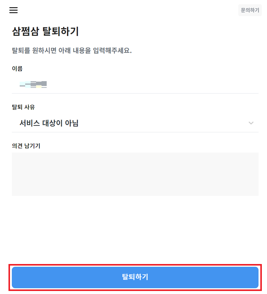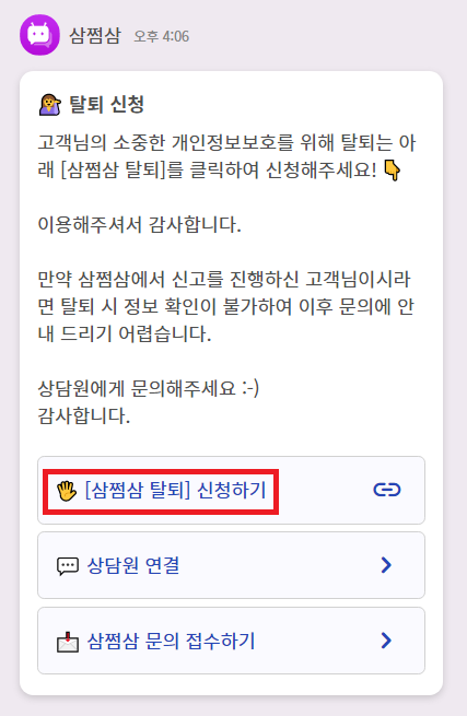 이후에 [삼쩜삼 탈퇴] 신청하기 버튼을 누르면 된다.