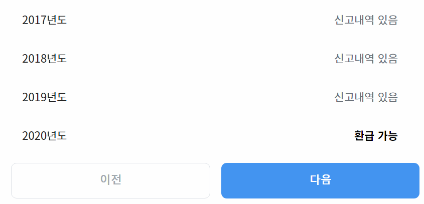 이때 신고를 하지 않아서 환급이 가능한 연도에 대해서는 다음과 같이 [환급 가능]이라는 메시지가 나온다.