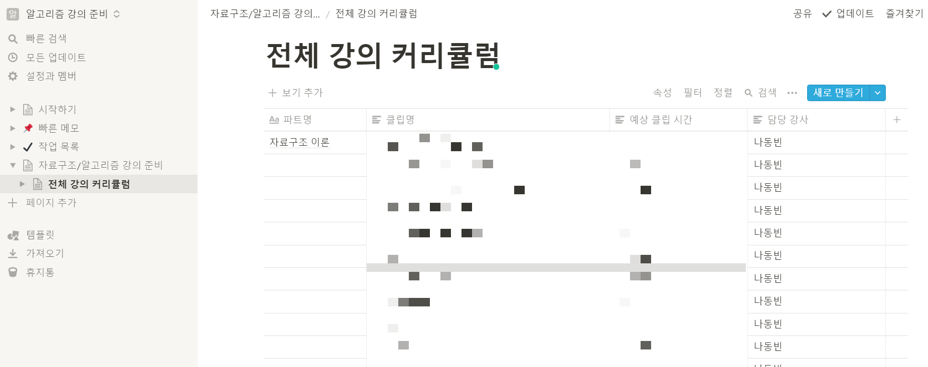 필자는 다음과 같이 "전체 강의 커리큘럼"이라는 이름의 엑셀 파일(.csv)을 불러왔습니다. 불러온 엑셀 파일은 다음과 같이 노션(notion)에서 보기 좋은 테이블(table) 형태로 출력되는 것을 알 수 있습니다.