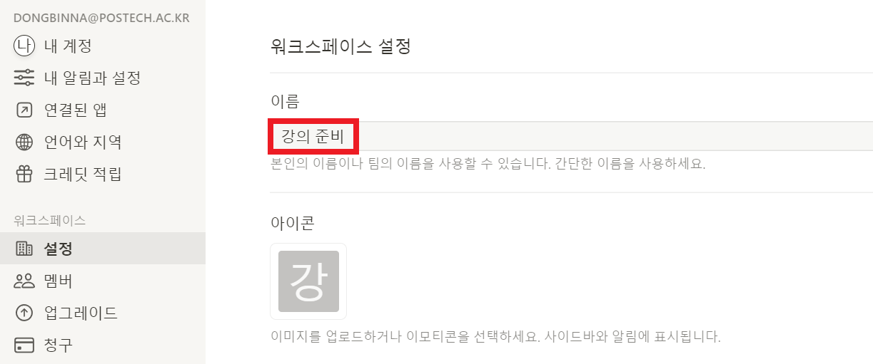 가장 먼저 워크스페이스를 만든 뒤에 [워크스페이스 이름]을 설정합니다. 예를 들어 "강의 준비"라는 이름으로 설정할 수 있습니다.
