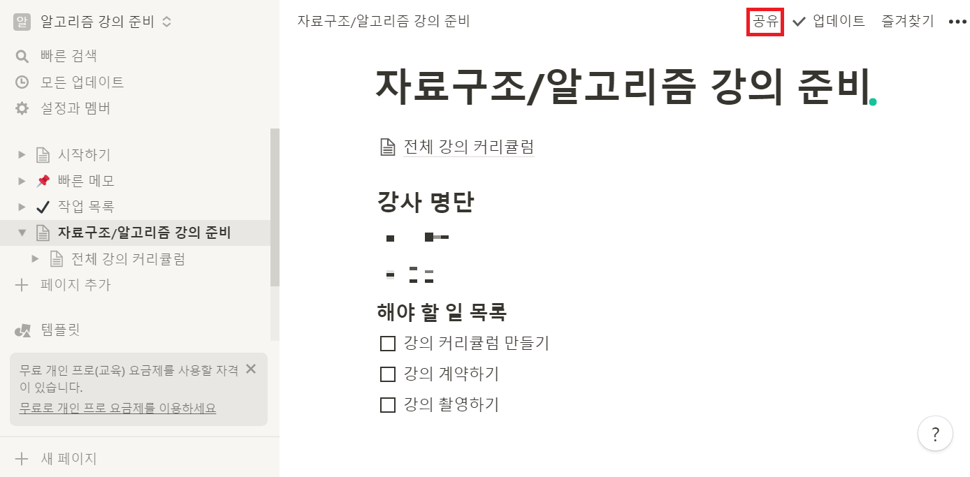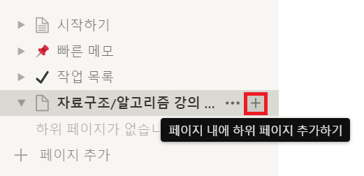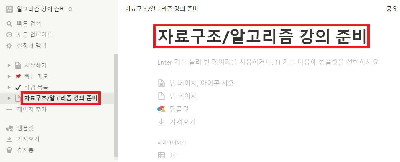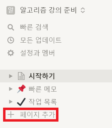 새로운 페이지를 추가하고 싶다면 [페이지 추가] 버튼을 누른 뒤에 제목을 넣으면 됩니다. 필자의 경우 다음과 같이 "자료구조/알고리즘 강의 준비"이라고 제목을 지었습니다.