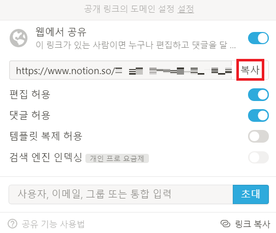 이후에 공유 설정을 진행할 수 있습니다. 필자의 경우 아는 지인에게 공유하는 것이기 때문에 [편집 허용] 및 [댓글 허용]에 체크하여 링크를 복사하여 공유했습니다. 이러한 설정으로 공유하는 경우, 해당 링크로 접속한 사람은 누구나 해당 페이지를 편집하는 것이 가능합니다.