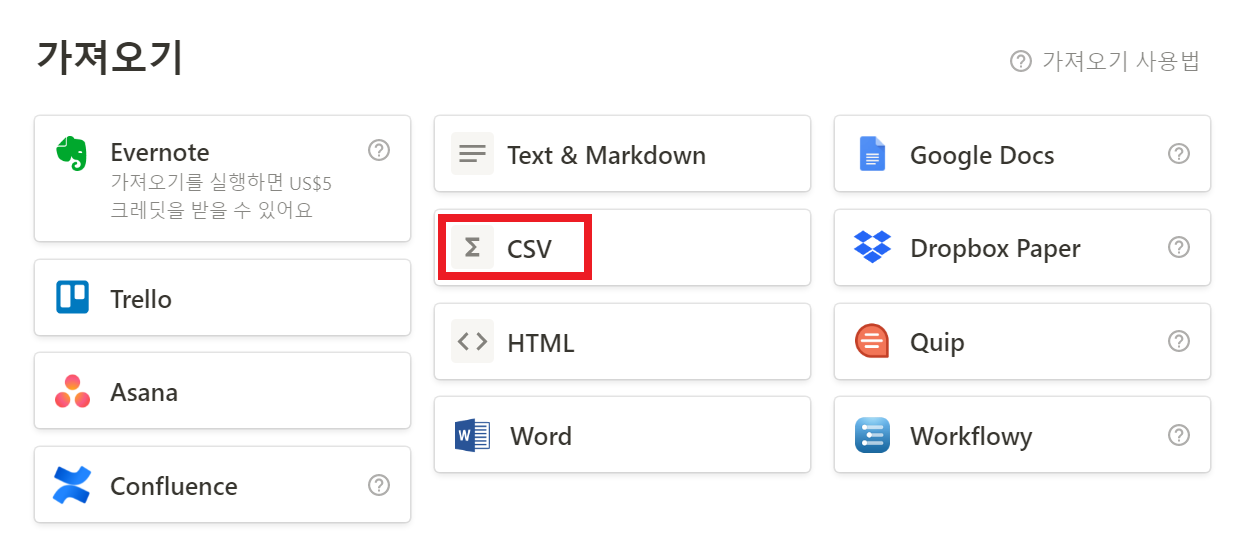 다음과 같이 기본적으로 CSV 확장자를 지원하는 것을 알 수 있습니다. 만약 엑셀 파일의 형식이 .xlsx 파일이라면 [UTF-8] 형식으로 인코딩(encoding)된 .csv 확장자로 변경한 뒤에 불러오기를 수행하면 됩니다.