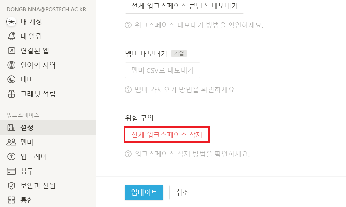 이후에 다음과 같이 [전체 워크스페이스 삭제]을 클릭하여 워크스페이스를 삭제할 수 있습니다.