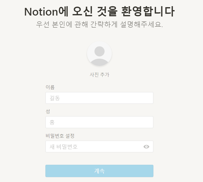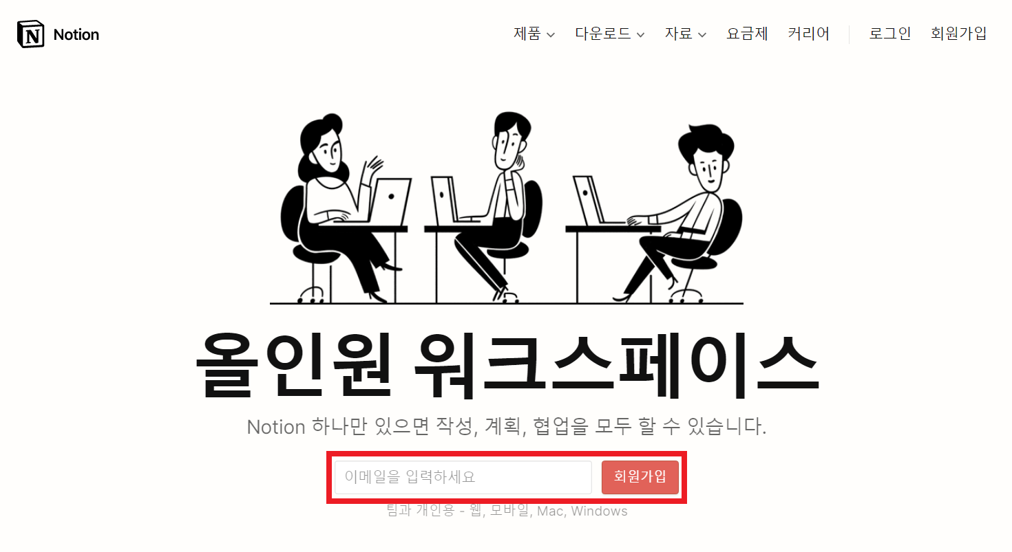 노션(notion)에 접속하면 다음과 같이 이메일 정보를 입력하고 [회원가입]을 진행할 수 있습니다.