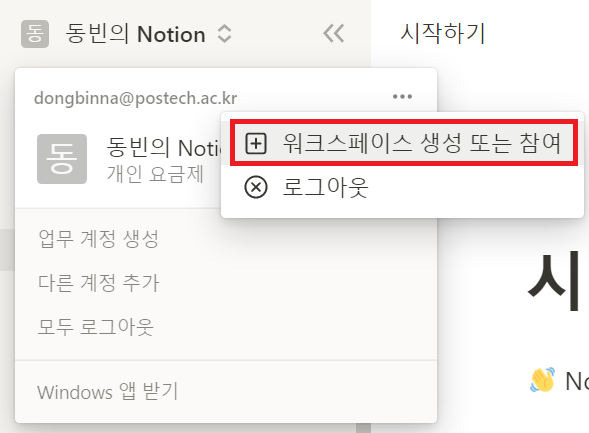 워크스페이스를 추가하고 싶을 때는 [워크스페이스 생성 또는 참여] 버튼을 누르면 됩니다. 그러면 새로운 워크스페이스가 만들어지는 것을 확인할 수 있습니다.