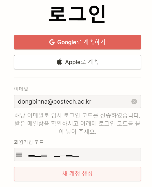메일로 인증 코드가 도착하고, 그것을 이용해 회원가입 및 로그인하면 됩니다.