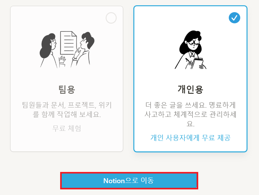 다음과 같이 간단하게 [개인용]으로 선택하여 무료로 회원가입을 진행할 수 있습니다. 참고로 무료 개인용도 꽤 사용할 만 합니다. 개인용도 5명의 게스트(guest)를 추가할 수 있고, 적은 용량이라면 파일 업로드가 가능하며, 실시간 공동 작업 및 링크 공유가 가능합니다. 또한 위키(wiki), 문서, 메모의 기능을 사용할 수 있습니다. 더불어 표, 리스트, 캘린더 등을 포함하여 문서를 작성할 수 있기 때문에 무료이지만 최소한의 기능을 제공한다고 볼 수 있습니다.