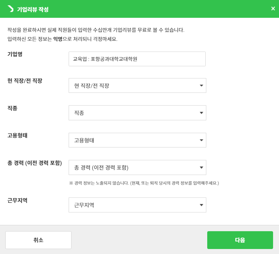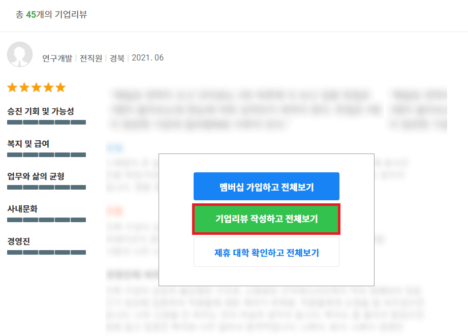 여기에서 [기업리뷰 작성하고 전체보기] 버튼을 눌러 기업의 리뷰를 작성할 수 있다.