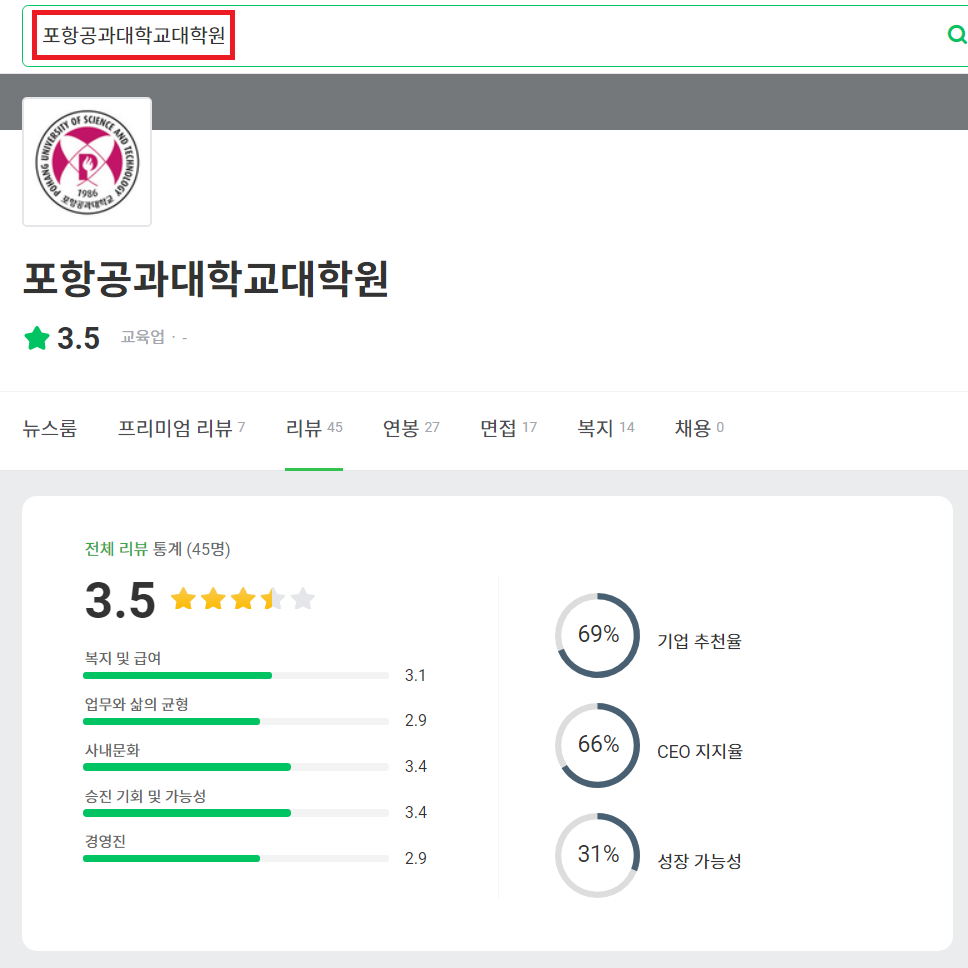 앞서 언급했드이 잡플래닛에서 다른 기업의 리뷰를 보려면, 내가 일했던 기업의 리뷰를 작성하면 된다. 따라서 필자의 경우 대학원에 있었으므로 다음과 같이 대학원 이름을 검색하였다.