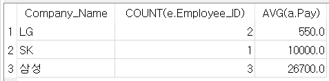 Q3. 각 회사별로 회사 이름과 사원의 수, 평균 월급을 출력합니다.