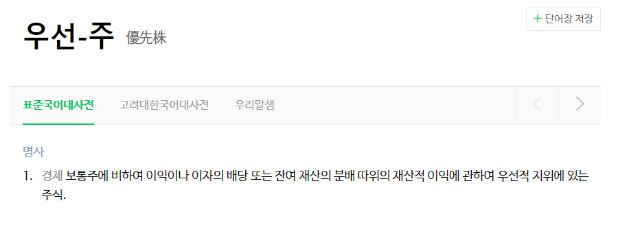 삼성전자우 (삼성전자 우선주): 보통주와는 다르게 의결권이 없다는 특징이 있다. 하지만 보통주보다 배당률이 높다. 그래서 의결권을 포기하고 배당금을 더 많이 받기 위해 위해 삼성전자 우선주를 구매하는 사람이 많다. 네이버 국어사전에 "우선주"를 검색해 보면 다음과 같이 나온다.