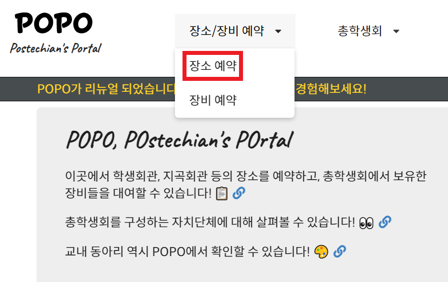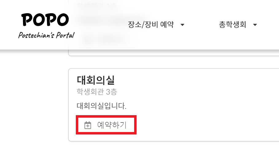 포항공대에서 학생회관이나 지곡회관의 회의실을 예약할 때는 POPO를 사용할 수 있다. 나는 포항공대에서 2년을 있었는데, 연구실에만 있다 보니까 회의실 예약하는 방법도 모르고 있었다. 학생회관 대회의실을 포함하여 다양한 회의실에 대하여 경우 동아리 활동을 하지 않는 일반적인 학생들도 예약할 수 있는 것으로 보인다.
