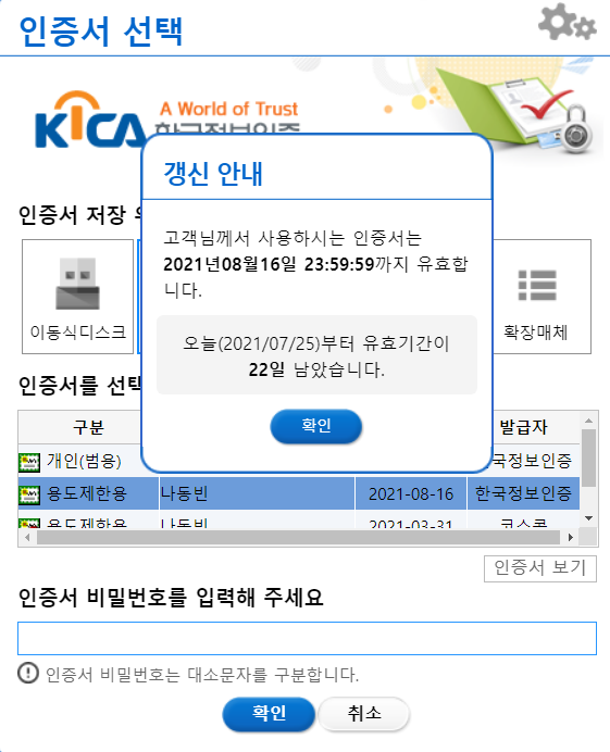 이어서 유효기간을 갱신하고자 하는 인증서를 선택하여, 비밀번호를 입력한다.