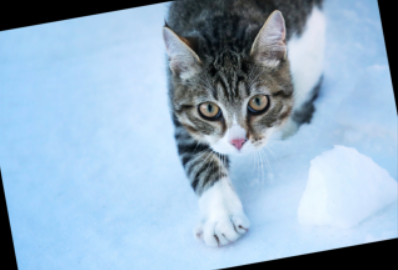 angle 값이 10일 때(angle=[10, 10], expand=False)의 또 다른 예시는 다음과 같다. 이 경우 회전만 시키고, 원래의 이미지 사이즈에 맞게 이미지를 resize하지 않기 때문에, 사진의 일부 영역이 가려져 보이지 않게 된다.