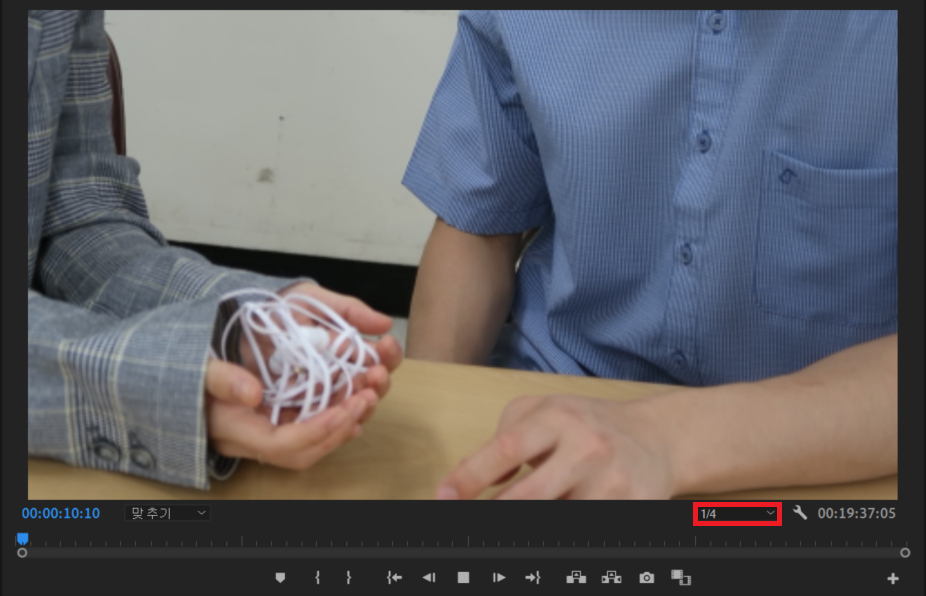 여기에서 재생 해상도를 설정할 수 있는데, 편집을 할 때에는 최대한 렉이 걸리지 않도록 하기 위해 [1/4]로 설정하는 것을 추천한다. 어차피 동영상 [내보내기] 이후에 고화질로 동영상을 볼 수 있기 때문에, 편집할 때는 고전적인 프리미어 튕김 문제나 렉으로부터 시간을 덜 뺏기기 위해 재생 해상도를 [1/4]로 설정하도록 하자.