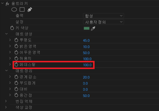 이후에 [키 색상] 속성의 값을 설정한다. 스포이드 도구를 이용하여 크로마키 천의 색상을 선택한다. 그러면 크로마키 천의 색상이랑 같은 요소들의 픽셀이 제거된다.