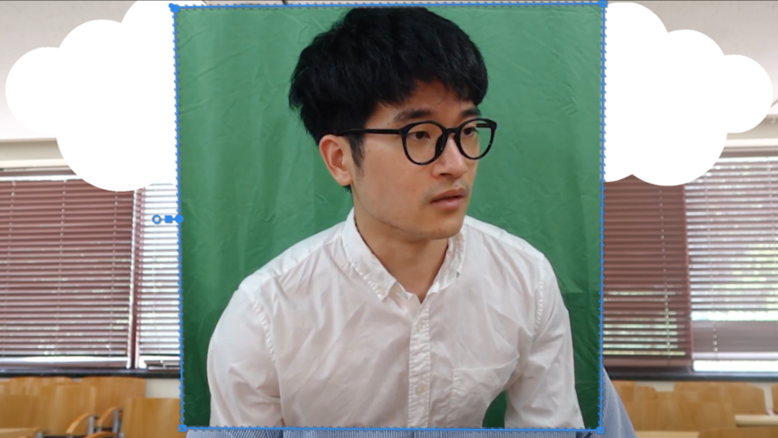 이제 위치를 적절하게 옮겨보자. 배경과 올바르게 섞였는지 확인할 수 있다. 다만 크로마키 천이 완전히 제거되지 않아서, 어색한 느낌이 나는 것을 알 수 있다.