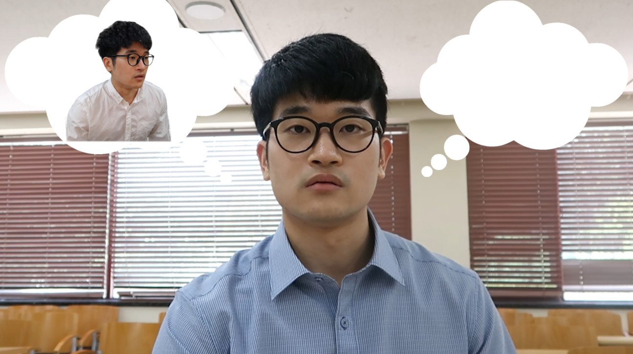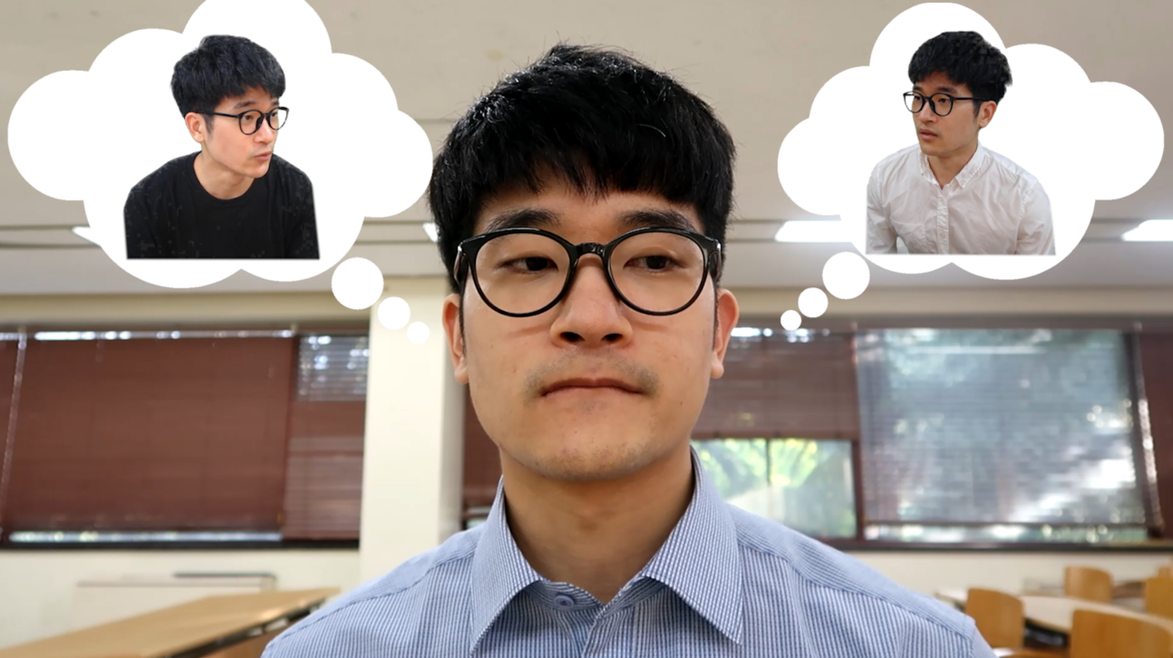 필자는 다음과 같이 천사와 악마 사이에서 고민하는 컨셉을 위해 크로마키 합성 기법을 활용했다.