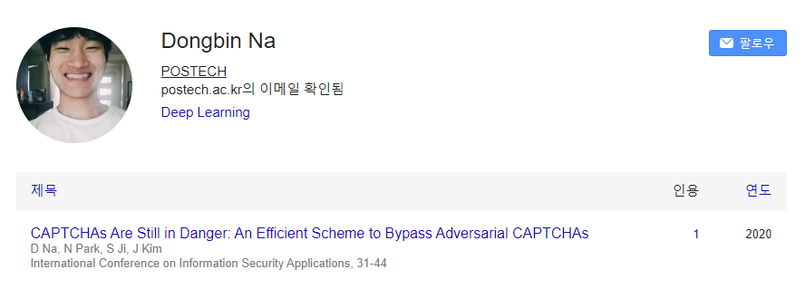 이후에 프로필 사진을 등록하면 다음과 같이 Google Scholar 프로필 설정이 완료된다.