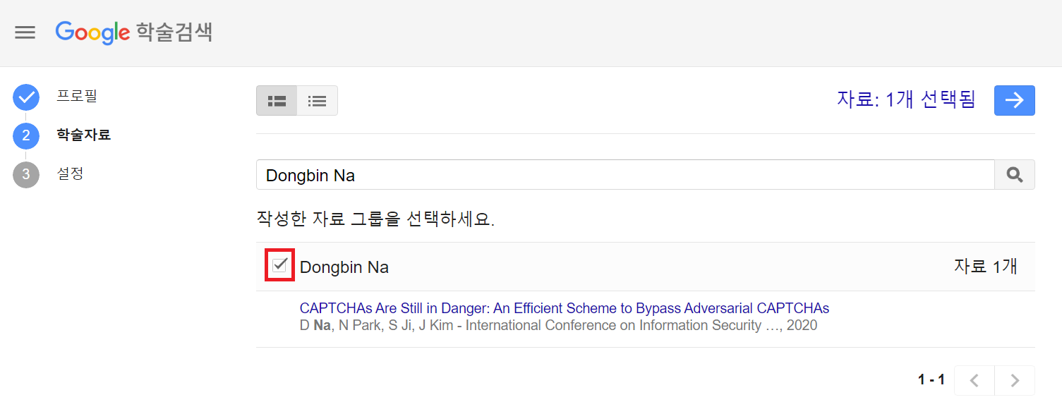 이후에 [학술자료]를 선택하는 페이지가 등장한다. 기존에 저술한 논문이 있으면, 다음과 같이 자동으로 검색되어 노출된다.