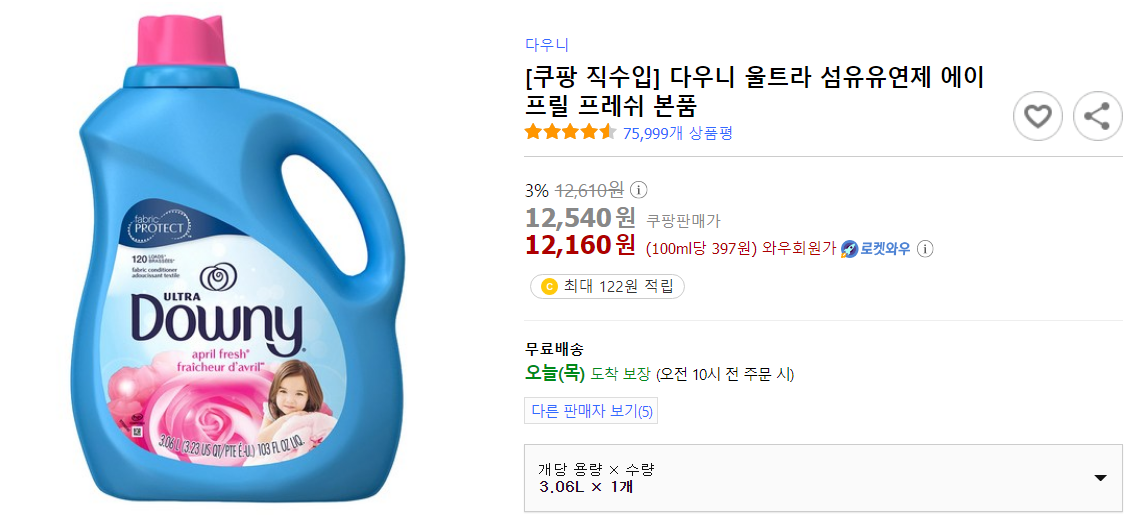 섬유유연제도 대충 평가가 괜찮은 제품 중에서 오늘 도착이 가능한 제품으로 구매했다.