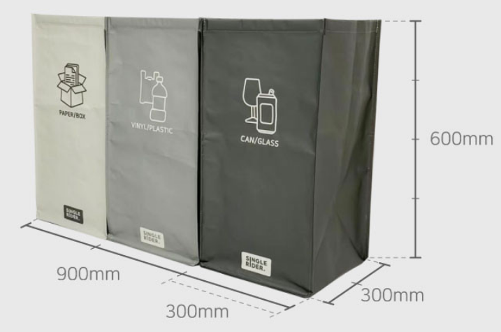 여기에 명시된 물건들은 가능하면 빠르게 구비하는 것이 좋다. 필자의 경우 일단 쓰레기 분리수거함부터 구매를 했다. 필자가 구매한 분리수거함의 제품명은 SINGLERIDER 가정용 재활용 3단 분리수거함인데, 필자는 다음과 같이 타코린백으로 된 제품을 선호하여 이를 구매했다. 종이, 플라스틱, 캔 박스로 나누어지며, 각 박스는 (너비 30cm X 깊이 30cm X 높이 60cm)이다.