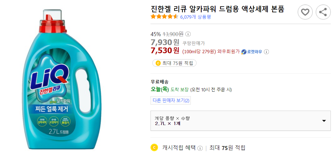 세탁 세제도 구매했다. 필자가 구매한 삼성전자 그랑데 세탁기는 드럼 세탁기이므로, 드럼용 액상세제를 구매했다.