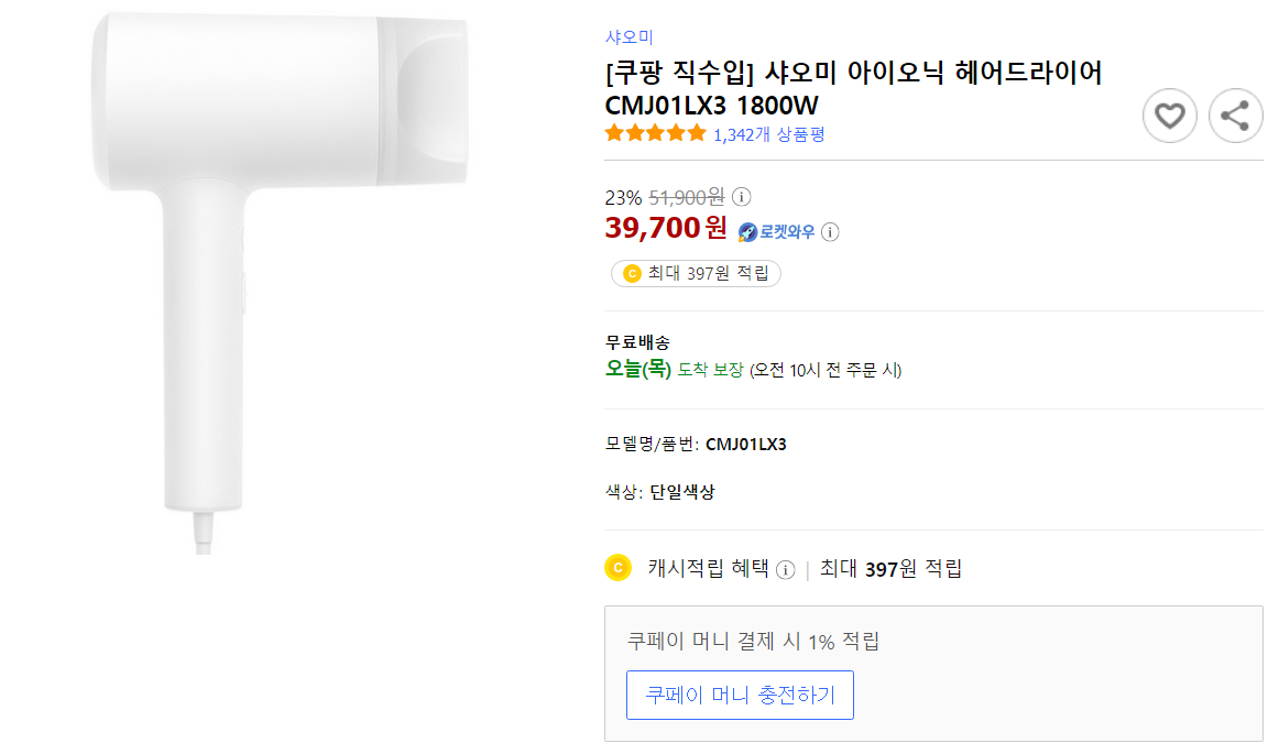 헤어 드라이기도 샀다. 딱 보자마자 디자인이 심플해 마음에 든다는 점에서 이걸로 구매했다.