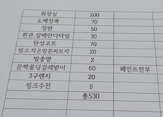 다른 사람이 이미 살고 있던 집에 들어가는 경우 수리가 필요하다. 이때 수리 기사님께 직접 집을 보여드리면서, 수리 항목에 대해서 함께 확인해 보면 좋다. 필자의 경우 이전 집주인이 집을 양호하게 관리하고 있었기 때문에, 다른 부분은 괜찮았으나 화장실 수리에는 비교적 많은 돈을 투자했다. 결과적으로 화장실을 제외한 다른 항목은 정말 최소한의 비용으로 수리를 진행했다. 필자는 24평형(방 세 개) 집에 혼자 지내게 되었는데, 평수에 비하여 굉장히 저렴하게 부분 수리를 진행했다. 필자는 다음과 같이 수리 비용으로 530만 원을 썼다.