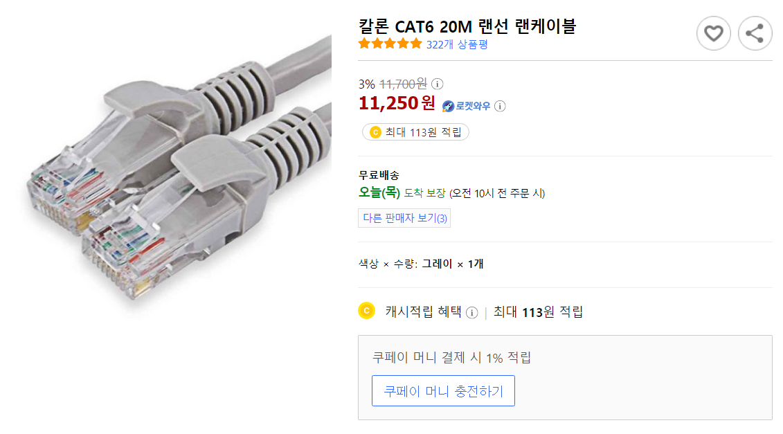랜선도 샀다. 필자는 가능하면 긴 랜선을 구매한 뒤에, 끈을 이용해 남는 길이의 선을 별도로 정리하는 방식을 선호한다.
