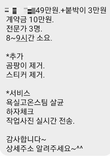 수리가 완료되었으면, 들어가기 전에 입주 청소를 진행해야 한다. 필자는 24평형 기준으로 나쁘지 않은 조건으로 입주 청소를 했다. 필자는 다음과 같이 50만 원이 넘는 돈을 지불했다. 청소 도중에 곰팡이가 피어 있는 부분 때문에 추가 요금이 2만 원 들었던 것으로 기억한다. (결과적으로 54만 원을 썼다.) 결과적으로 이와 같이 (수리 + 입주 청소)를 모두 마치고 나면 살만한 곳이 된다.