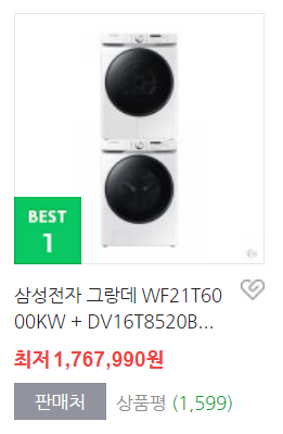 필자는 세탁기와 건조기를 모두 포함하고 있는 워시타워(세탁기 + 건조기)를 구매했다. 처음에 필자는 ① LG전자 워시타워 W16WTA 제품(가로 700 X 높이 1890 X 깊이 770)과 ② 삼성전자 그랑데 WF21T6000KW + DV16T8520BW 제품(가로 686 x 높이 984 X 깊이 796) 사이에서 고민했다. 또한 세탁기와 건조기를를 구매하기 전에는 베란다에 제품이 들어갈 수 있는지 확인해 볼 필요가 있다. 필자의 베란다는 가로 너비가 880mm 정도라서 설치 자체는 가능한 것으로 보였다. 그리고 삼성전자 세트는 다음과 같이 당시 네이버 쇼핑 BEST 1이었기 때문에, 이것으로 구매하고자 하는 마음이 생겼다.