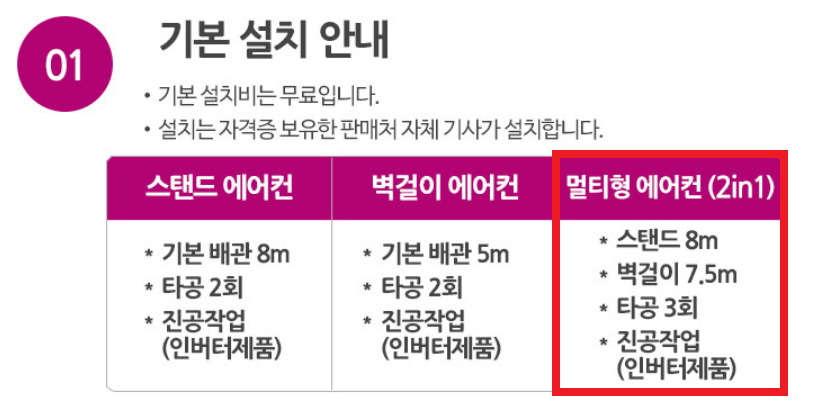 생활하는 데에 있어서 에어컨도 필수적이다. 필자의 집은 24평형(방 세 개)이므로 멀티형(투인원) 에어컨으로 구매했다. 일반적으로 멀티형 에어컨을 이용하게 되면 1대의 실외기로 2대 이상의 실내기를 운전할 수 있기 때문에, 상당히 효율적이다. 필자는 스탠드 에어컨은 거실과 같이 집 전체를 시원하게 할 수 있는 곳에 설치하고, 벽걸이 에어컨은 자는 곳에 설치하기 위해 멀티형 에어컨으로 구매했다. 필자는 다음과 같이 FQ17V9KWC2를 구매했는데, 기본 설치 조건으로 타공 3회, 진공작업이 포함되어 있다. 필자는 본 에어컨을 153만 원에 구매했다.