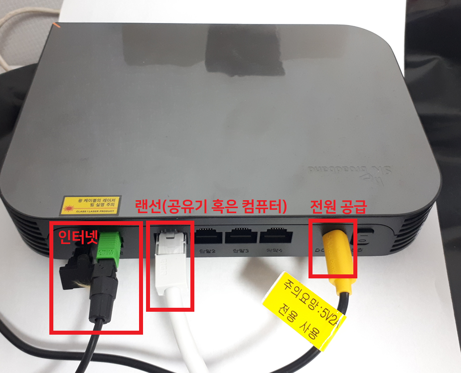 설치된 모뎀은 다음과 같이 생겼다. 인터넷 선과 전원 공급 선은 모두 연결을 해주고 가셨기 때문에, 랜선만 가지고 있다면 곧바로 컴퓨터에 연결해 인터넷을 사용할 수 있었다. 필자는 별도로 공유기를 구매하여 랜선을 통해 모뎀과 연결해 주었다.