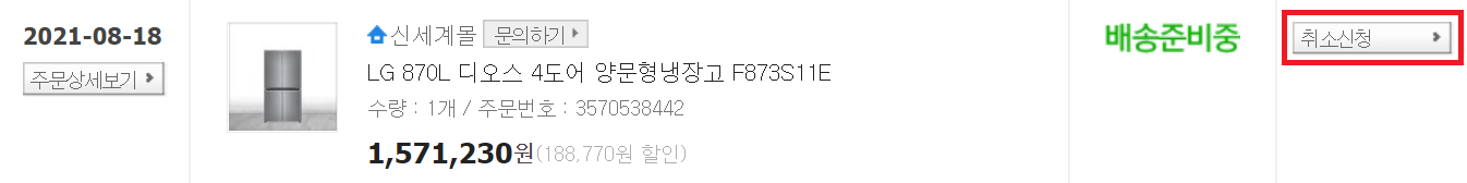 다만, 슬프게도 설치 기사님이 방문했을 때, 내 집 문의 너비가 딱 80cm라서 냉장고가 들어올 수 없었다. 그래서 설치 기사님이 그대로 돌아가셨고, 필자는 어쩔 수 없이 [취소신청]을 해서 환불을 받게 되었다. 설치 기사님께서는 60cm 너비의 냉장고를 구매하는 것을 추천해 주셨다.