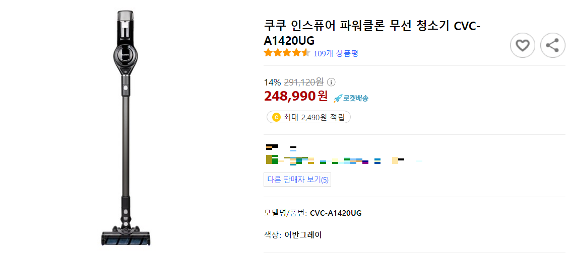 필자는 쿠쿠 CVC-A1420UG 제품을 구매했다. 가격도 청소기 중에서는 저렴한 편이고, 상품 평가도 괜찮다는 점에서 이를 구매했다. 약 25만 원을 지불했다.