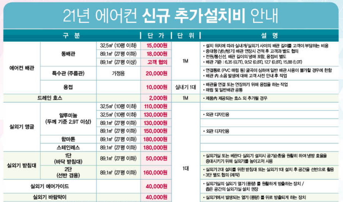 다만, 에어컨을 구매할 때는 추가 설치 비용에 대해 사전에 자세히 조사해 보는 것이 중요하다. 일단 구매 페이지에서는 다음과 같이 기본 설치는 무료고, 타공 3회 및 기본적인 배관을 제공한다고 한다. 필자의 경우 에어컨 추가 설치 비용으로 50만 원 정도의 금액이 청구되었다. 그 이유에 대해 설명하겠다. 처음에 필자의 집에는 앵글이 없어서, 실외기 앵글을 설치하기 위해 18만 원이 추가되었다. 그래서 베란다 밖에 실외기를 설치하던 도중에 아파트 관리자 분이 오셔서 필자가 사는 집은 베란다 밖에 실외기를 달지 않고, 실외기를 1층으로 내리거나 옥상으로 올리는 집이라고 말씀하셨다. 그래서 결국 실외기 앵글 비용은 그대로 지불하게 되었고, 에어컨 기사님이 실외기를 1층 화단으로 옮겨서 다시 설치했다. 다만 이렇게 하면 배관의 길이가 더 길어지고, 실외기가 1층 화단에 놓인다는 점에서 에어컨의 성능 및 수명이 떨어지는 문제가 발생할 수 있다. AS도 어려울 수 있다고 하셨다.