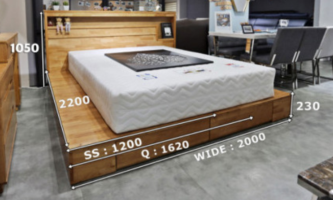 일단 가장 중요한 것이 잠을 잘 수 있는 공간이다. 그래서 침대 프레임을 구매해야 한다. 필자는 아래의 제품을 구매했는데, 그냥 네이버 쇼핑에서 찾다가 괜찮아 보여서 샀다. 일단 최대한 큰 크기의 침대 프레임을 수납형으로 구매했다. 필자가 구매한 WIDE(와이드) 침대 프레임은 2200 X 2000의 크기를 가진다. (헤드 부분을 제외해도 2000 X 2000 정도 크기의 매트리스를 넣을 수 있다.) 이러한 침대 프레임은 약 60만 원에 구매했다. 또한 배송비는 별도로 6만 원이었는데, 필자의 경우 아파트 특성상 2만 원 추가 배송 비용이 붙었다.