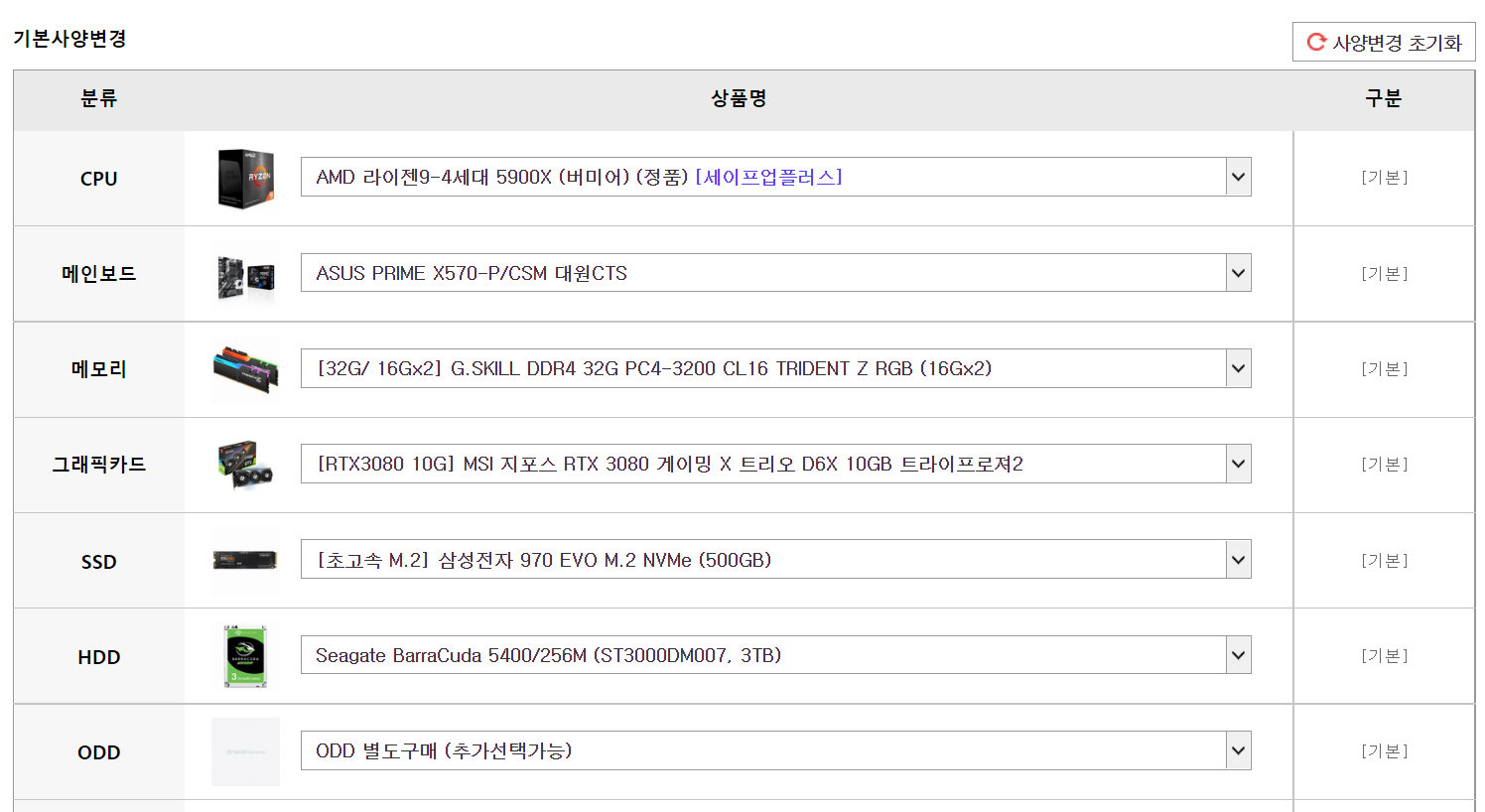 이후에 다음과 같이 해당 제품의 [기본사양]을 확인할 수 있다. 여기에서 어떤 제품으로 구성되어 있는지 확인해 보는 것에만 목적을 두는 것이 좋다. 왜냐하면 이 제품 구성 그대로 사는 것도 가능하기는 하지만, 동일한 제품 구성을 더욱 저렴하게 살 수 있는 경우도 있기 때문이다. 그러니까 일단 확인만 해보자. 기본 구성은 다음과 같다고 한다.